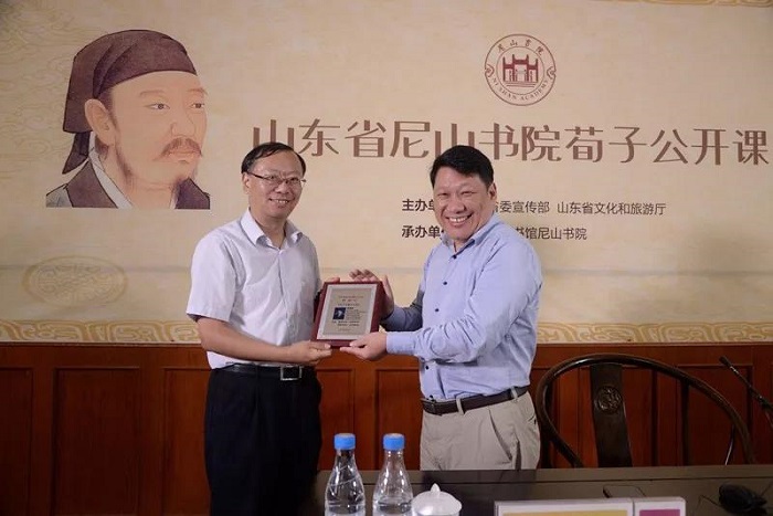 开讲前,山东省图书馆副馆长、山东省尼山书院秘书长李西宁向李承贵教授赠送尼山书院荀子公开课“纪念感谢状”。